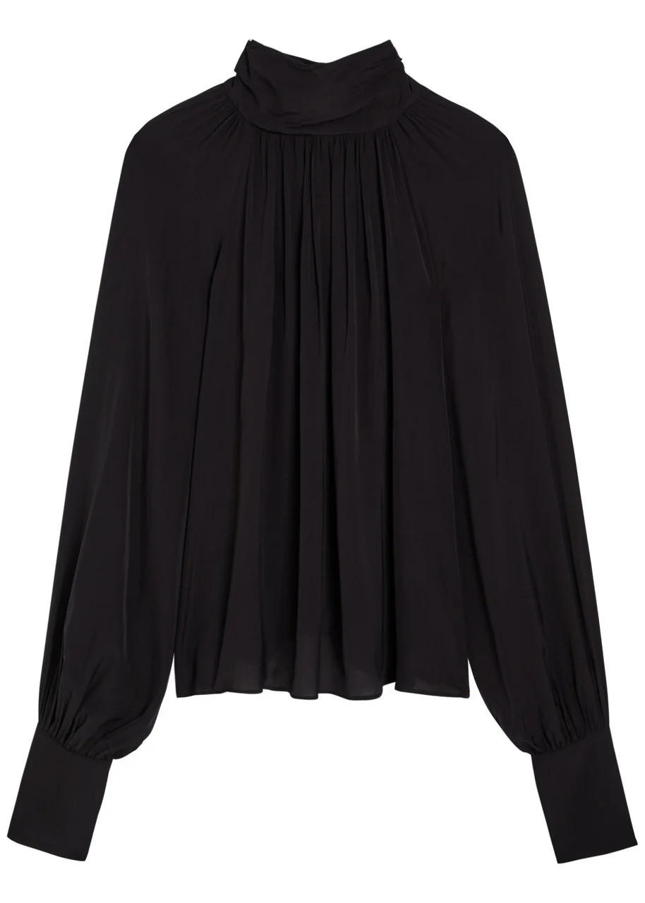 Info & Care Anine Bing poplin blouse Draped design, high-neck, raglan balloon sleeves, button-fastening cuffs, pleated; Button fastenings at back 100% viscose Dry clean Size & Fit Length shoulder to hem: 23 inches/ 58.5cm Lightweight Loose fit Model is 5'9"/ 175cm and wears a size small