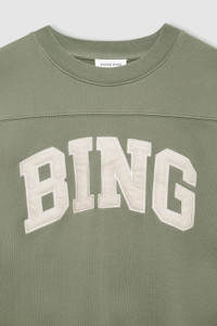 A relaxed collegiate crewneck pullover made from midweight 100% cotton fleece in washed olive that's brushed on the inside. - Cotton fleece - Relaxed fit - Vintage-inspired front seam detail - Burgundy felt BING patch with ivory satin border at the chest Please note: This item is handcrafted and will vary in color or appearance. FIT + MEASUREMENTS Relaxed, Oversized Fit: Take your true size. Model is wearing a size S. Model Measurements: Height: 5'9.5", Bust: 32", Waist: 24.5", Hips: 33" Product Measurements (Size S): Height 5'10", Bust 30", Waist 24, Hips 33.5" MATERIAL + CARE 100% Cotton Machine wash separately Made in Turkiye
