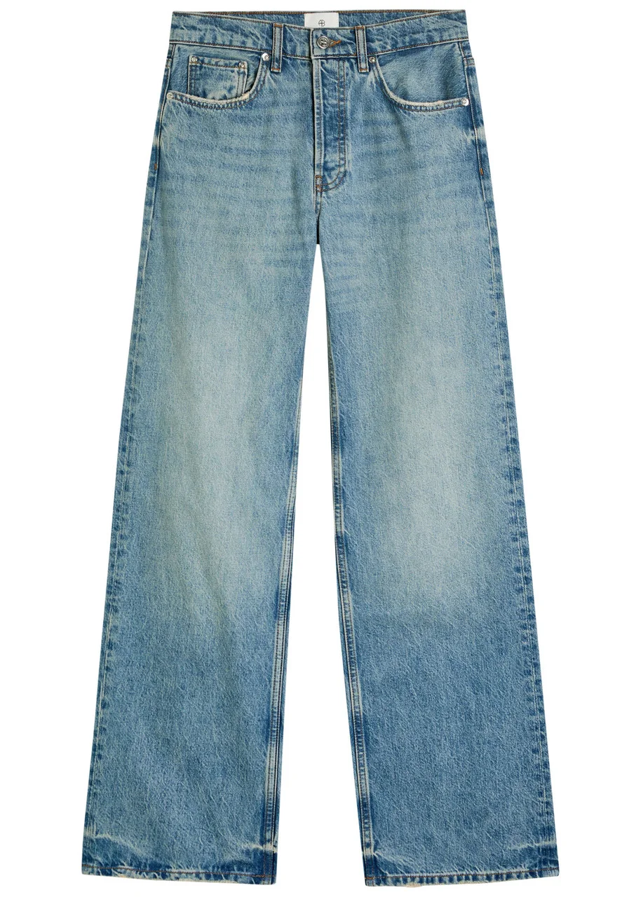 Info & Care Anine Bing denim jeans; High-rise fit, wide-leg cut, belt loops, five pockets, designer plaque at back, slightly distressed trims, whiskered and faded finish Partially concealed button fastenings at front; 100% cotton Machine wash cold inside out to avoid colour transfer Size & Fit Front rise: 10 inches/ 25.5cm Inside leg length: 33 inches/ 84cm Midweight Model is 5'9"/ 175cm and wears a size W27