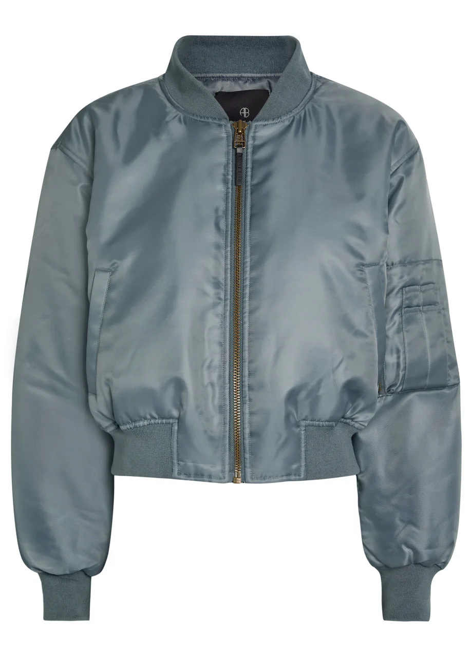 Info & Care Anine Bing satin-twill bomber jacket Padded, stand collar, rounded sleeves, zip-fastening sleeve pocket, press-stud fastening front flap pockets, designer plaque at back, ribbed trims, two internal press-stud fastening slip pockets, fully lined Zip fastening through front 100% polyester; lining: 57% polyester, 43% viscose Dry clean Size & Fit Length shoulder to hem: 19 inches/ 48.5cm Midweight Boxy fit, cropped Model is 5'9"/ 175cm and wears a size small