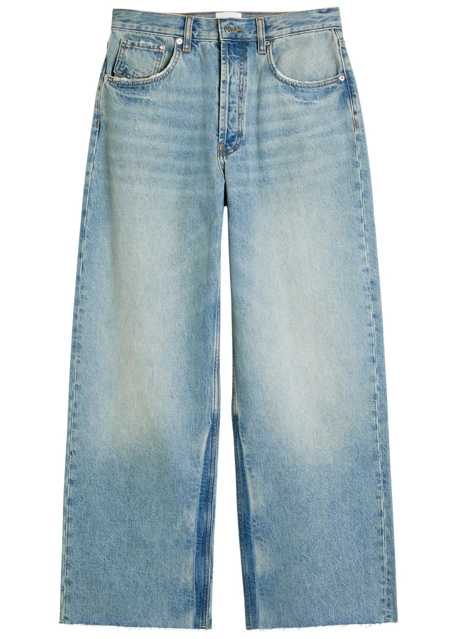 Info & Care Anine Bing denim jeans High-rise fit, wide-leg cut, belt loops, five pockets, washed panels through legs, leather designer plaque at back, distressed details, washed finish Partially concealed button and zip fastening at front 100% cotton Machine wash cold inside out to avoid colour transfer Size & Fit Front rise: 11.5 inches/ 29cm Inside leg length: 30 inches/ 76cm Midweight Model is 5'9"/ 175cm and wears a size;W27