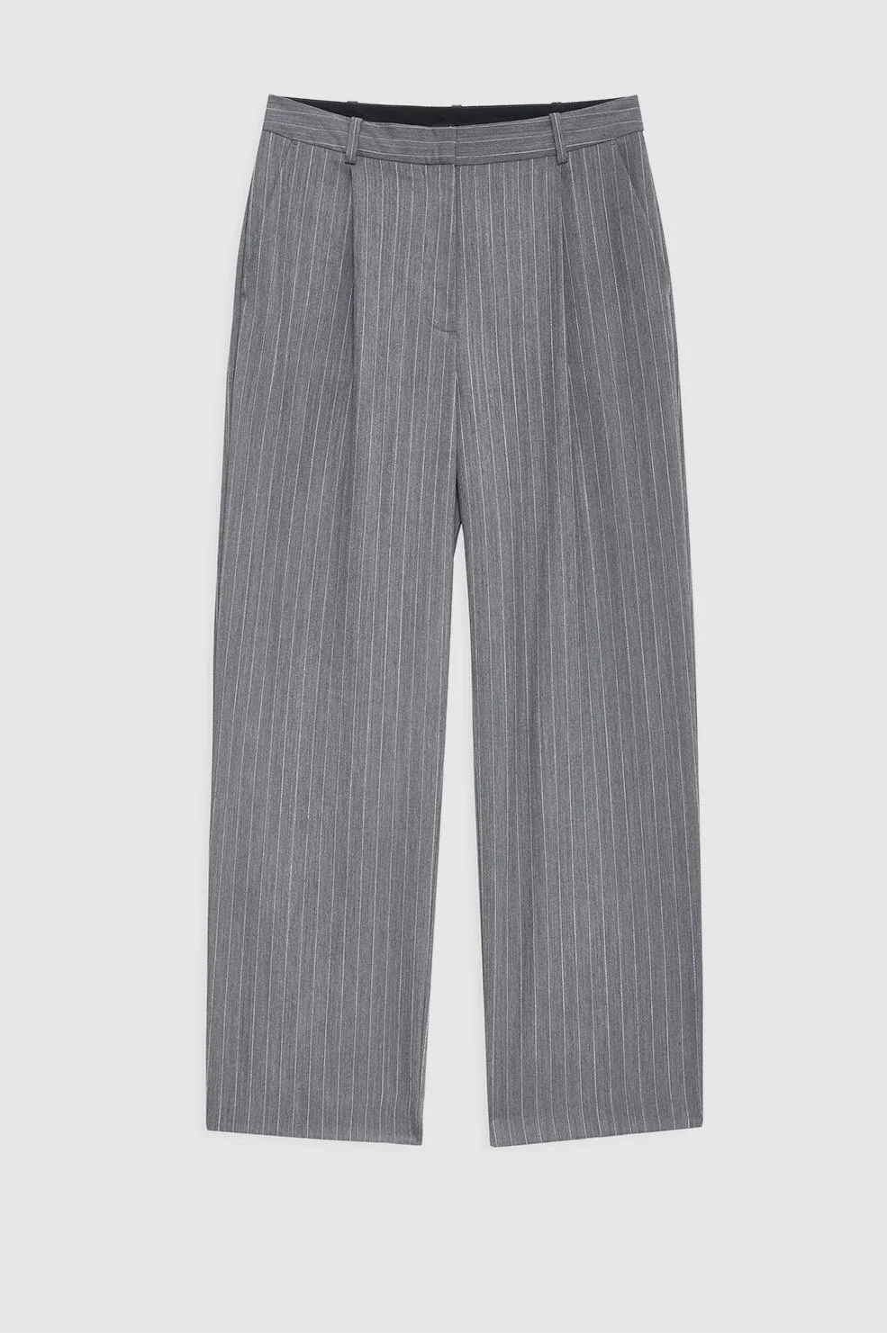 The Trent Trouser features a cropped take on the traditional tailored silhouette made from a midweight, textured wool suiting fabrication in a grey pinstripe. - Wool blend - Half-lined to the knee - Cropped fit - Low-to-mid rise - Front zip opening with a hook and bar closure - Wide leg - Long inseam - Functional belt loops - Pleat detailing - Front slanted pockets FIT + MEASUREMENTS Low-To-Mid Rise, Relaxed Leg, Full-Length Inseam: Take your true size. Model is wearing a size 30. Model Measurements: Height: 5'8", Bust: 31", Waist: 25.5", Hips: 35.5" Product Measurements (Size 36/6): Inseam: 33", Rise: 11.8", Waist: 30", Hip: 47", Leg Opening: 22" MATERIAL + CARE 98% Wool 2% Other Fibers Dry clean Made in Bulgaria