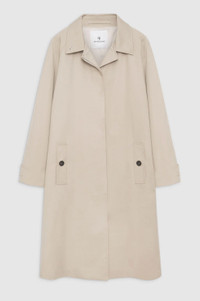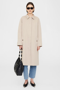 A menswear-inspired trench coat made from a fully lined, lightweight cotton-twill fabrication with a water-resistant finish. This transitional layer features an oversized silhouette with concealed horn buttons down its center-front opening and button tab closures at the wrist. Two large welt pockets and discrete interior pockets add to its overall practical construction. The Randy Oversized Trench is cut for an oversized, straight fit with a midi-length hemline. Take your true size, or size down if a closer fit is preferred. FIT + MEASUREMENTS The Randy Trench is cut for an oversized, straight fit with a midi-length hemline. Take your true size, or size down if a closer fit is preferred. Model is wearing a size S. Model Measurements: Height: 5'10.5", Bust: 31", Waist: 24", Hips: 34" Product Measurements (Size S): Length: 43.5", Bust: 48", Sleeve Length from Center Back: 33" MATERIAL + CARE 98% Cotton, 2% Elastane Dry clean Made in Turkey