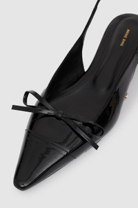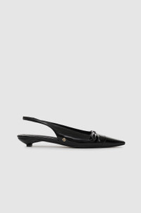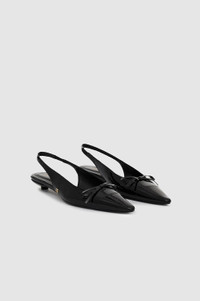 A sophisticated style made from 100% patent leather with a high-shine finish. The Zoey Slingback Heels feature a flat bow detail across the top with a subtle, rounded square toe and sleek leather toe cap, mini kitten heel, and slingbacks with elastic. Finished with a padded insole, high-shine leather outsole, and gold-tone ANINE BING hardware. Take your true size. If you are between sizes, we recommend taking the next size up. FIT + MEASUREMENTS Take your true size. If you are between sizes, we recommend taking the next size up. Model is wearing a size 40. Model Measurements: Height: 5'9.5", Bust: 32", Waist: 24.5", Hips: 33" Product Measurements (Size 37): Sole Length: 9.8", Sole Width: 2.4", Heel Height: 0.2", Shoe Height: 3.7" MATERIAL + CARE 100% Cow Leather Spot Clean Made in Turkiye