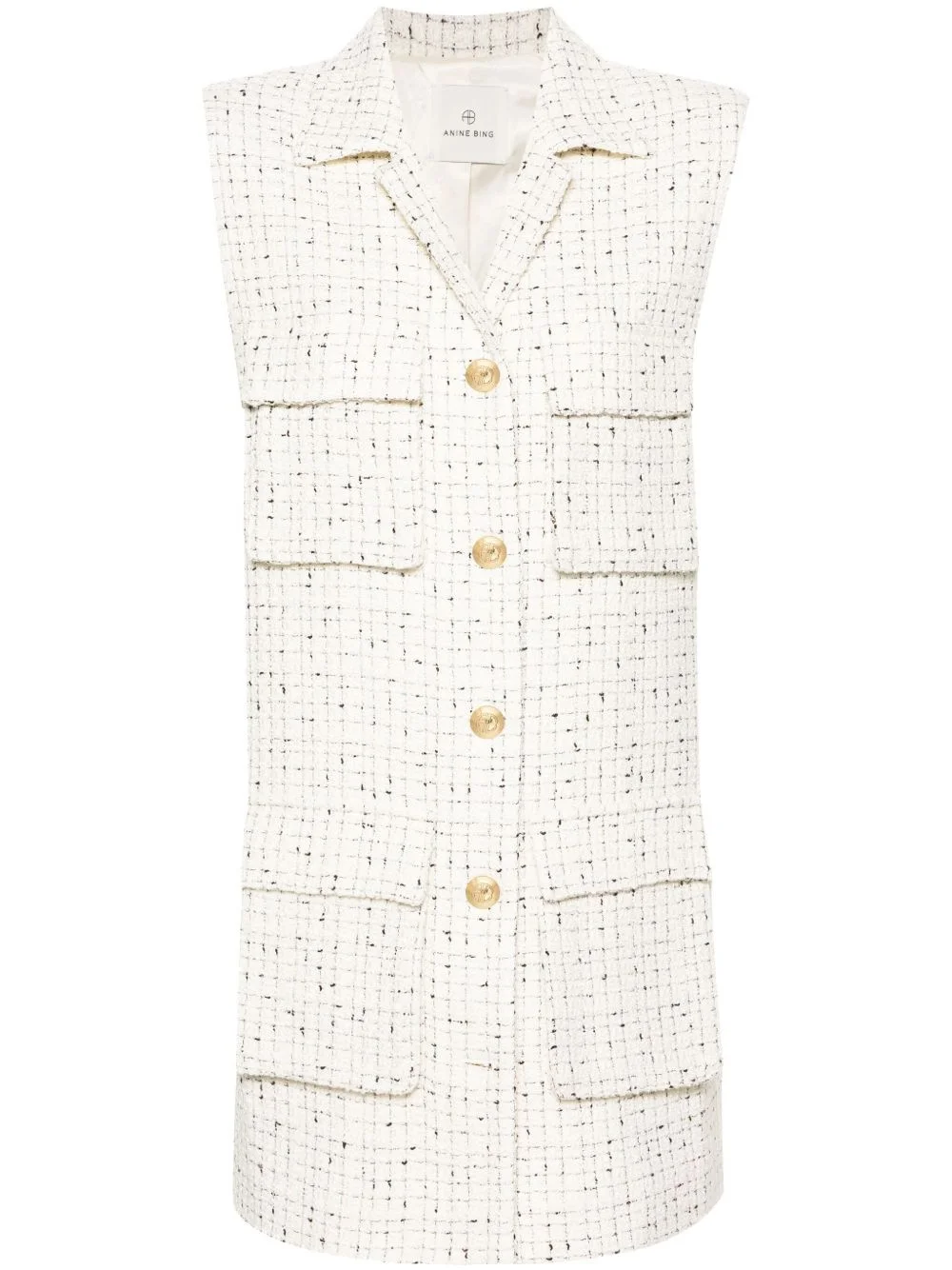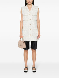 single-breasted tweed gilet Highlights - White/black - Tweed - Metallic threading - Camp collar - Front button fastening - Logo-embossed buttons - Shoulder pads - Sleeveless - Straight arms - Four front flap pockets - Full lining Imported Composition Outer: Acrylic 69%, Wool 26%, Polyester 3%, Nylon 1%, Metallic Fibre 1% Lining: Polyester 57%, Viscose 43% SIZE & FIT Model measurements Height 5 ft 11 in(1.8 m) Bust/Chest 33.07 in(84 cm) Hips 37.4 in(95 cm) Waist 25.19 in(64 cm) FittingInformation Designed to be unstructured, offering a loose fit throughout The internal shoulder pads offer a structured shape Made from a midweight non-stretch fabric This piece fits true to size – take your usual size Washing instructions Dry Clean Only