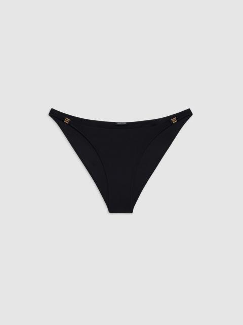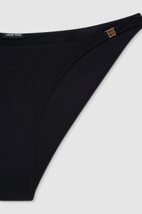 The Bellamy Bikini Bottom is constructed from a soft and stretchy swim fabrication in black. This fully lined swim separate is finished with thin side straps and a small hand-tacked ANINE BING monogram charm. The Bellamy Bikini Bottom is cut for a close fit with a low waistline and modest back coverage. Take your true size. FIT + MEASUREMENTS The Bellamy Bikini Bottom is cut for a close fit with a low waistline and modest back coverage. Take your true size. Model is wearing a size S. Model Measurements: Height: 5'9", Bust: 30", Waist: 23", Hips: 34" Product Measurements (Size S): Waist: 14.3", Rise: 9.3" MATERIAL + CARE 85% Recycled Nylon, 15% Spandex Hand wash Made in Indonesia