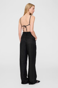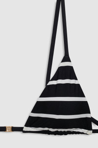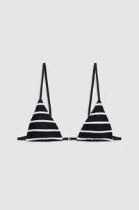 The Bellamy Bikini Top is constructed from a recycled nylon-spandex fabrication in black and white stripes. - Nylon-spandex blend - Fully lined - Close fit - Minimal coverage - Shirred at the cups for more or less coverage - Thin adjustable straps - Hand-tacked monogram charm FIT + MEASUREMENTS Close Fit: Take your true size. Model is wearing a size S. Model Measurements: Height: 5'7.5", Bust: 32", Waist: 23.5", Hips: 34.5" Product Measurements (Size S): Cup Width: 4.5", Cup Height: 6" MATERIAL + CARE 85% Recycled Nylon, 15% Spandex Spot clean Made in Indonesia