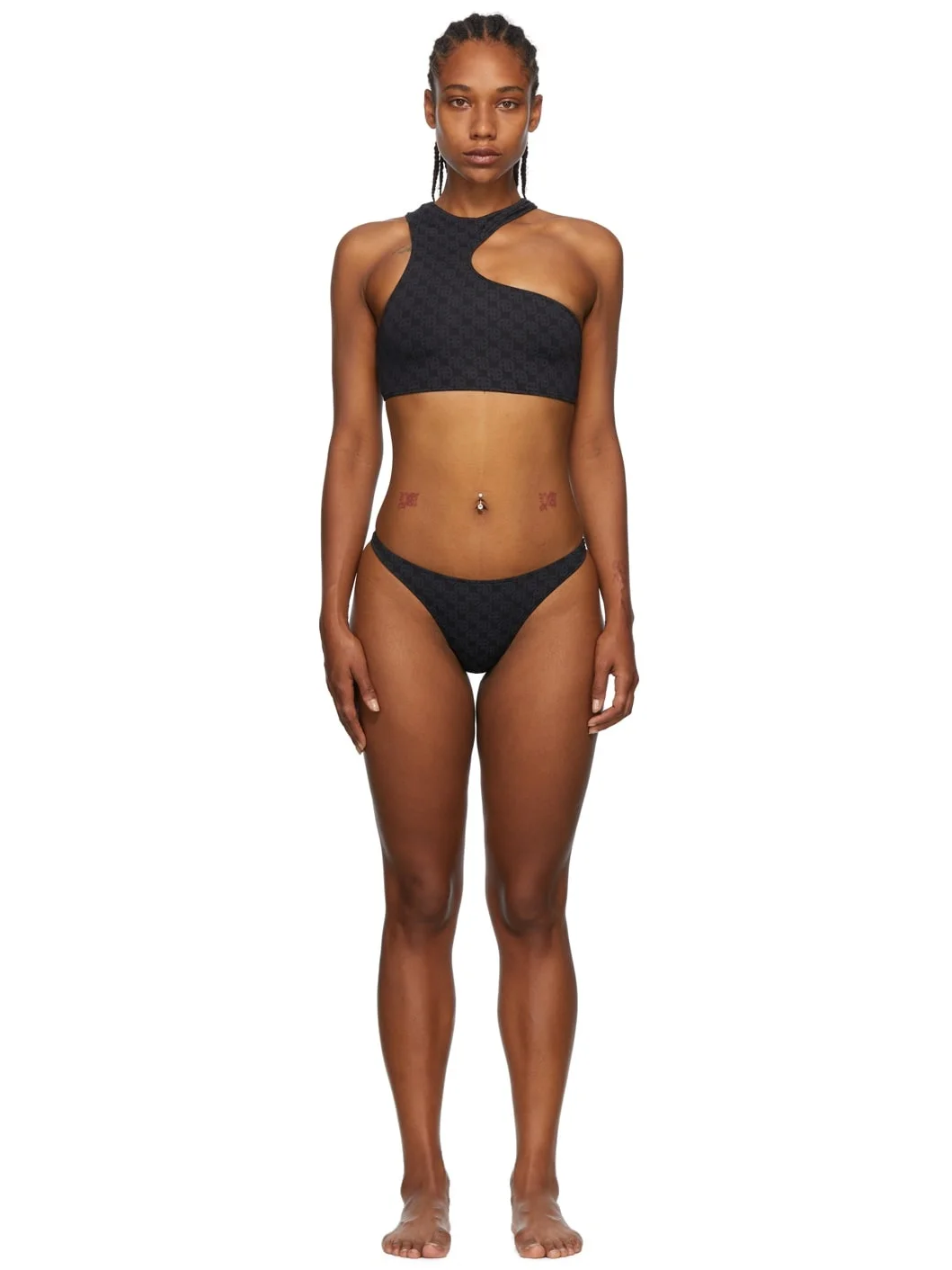 Stretch recycled nylon bikini top. Asymmetric construction. · Logo pattern printed throughout · Crewneck · Racer back · Full jersey lining Stretch recycled nylon bikini bottoms. · Logo pattern printed throughout · Full jersey lining Supplier color: Black 85% recycled nylon, 5% elastane. Made in Indonesia 222092F105004