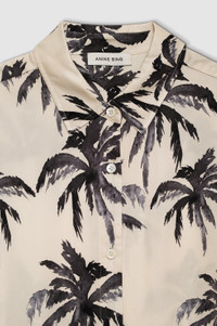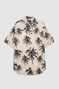 The Tristan Shirt is a relaxed button-up made from a lightweight, sand-washed cupro blend with a hand-painted, watercolor palm tree print. - Cupro blend - Oversized, boxy fit - Elbow-length sleeves - Branded mother of pearl buttons - Long shirttail hem FIT + MEASUREMENTS Oversized, Boxy Fit: Take your true size. Model is wearing a size S. Model Measurements: Height: 5'9.5", Bust: 32.5", Waist: 24.5", Hips: 35" Product Measurements (Size S): Length: 30.8", Bust: 47", Sleeve Length: 9.8" MATERIAL + CARE 60% Cupro, 40% Viscose Dry clean Made in China