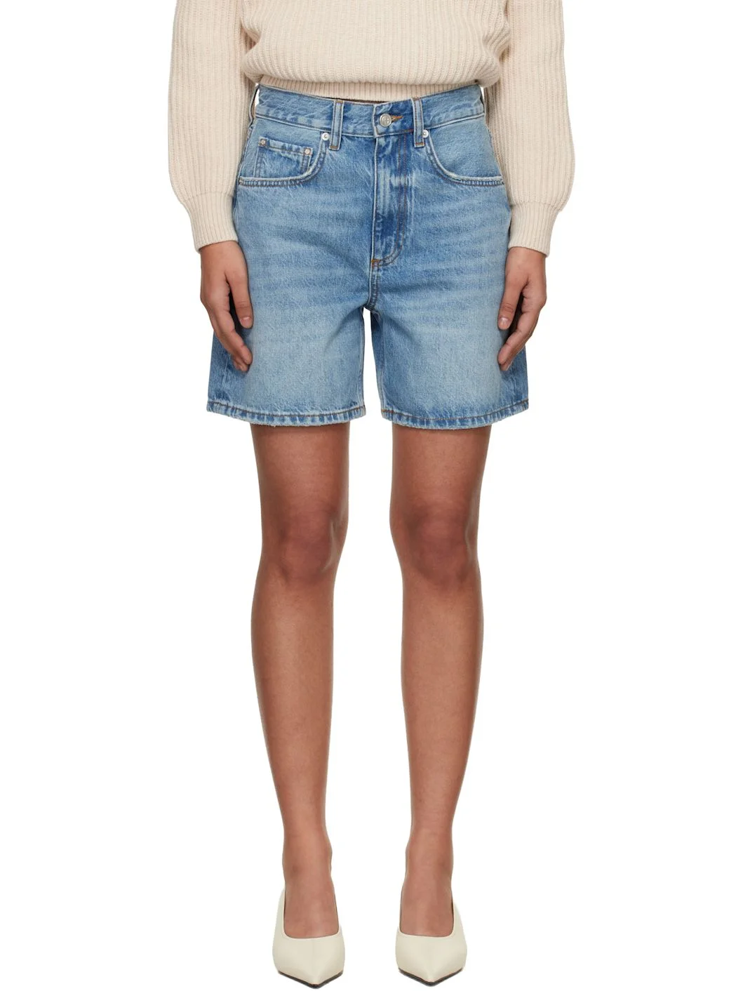Non-stretch denim shorts. · Fading, distressing, and whiskering throughout · Wide-leg · Mid-rise · Belt loops · Five-pocket styling · Zip fly · Leather logo patch at back waist · Logo-engraved silver-tone hardware · Contrast stitching in tan Supplier color: Caspian Blue Body: 100% cotton. Lining: 80% recycled polyester, 20% organic cotton. Made in Turkey 261092F088001