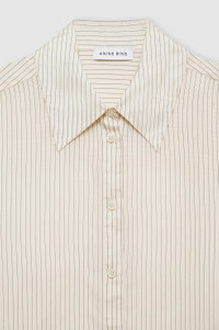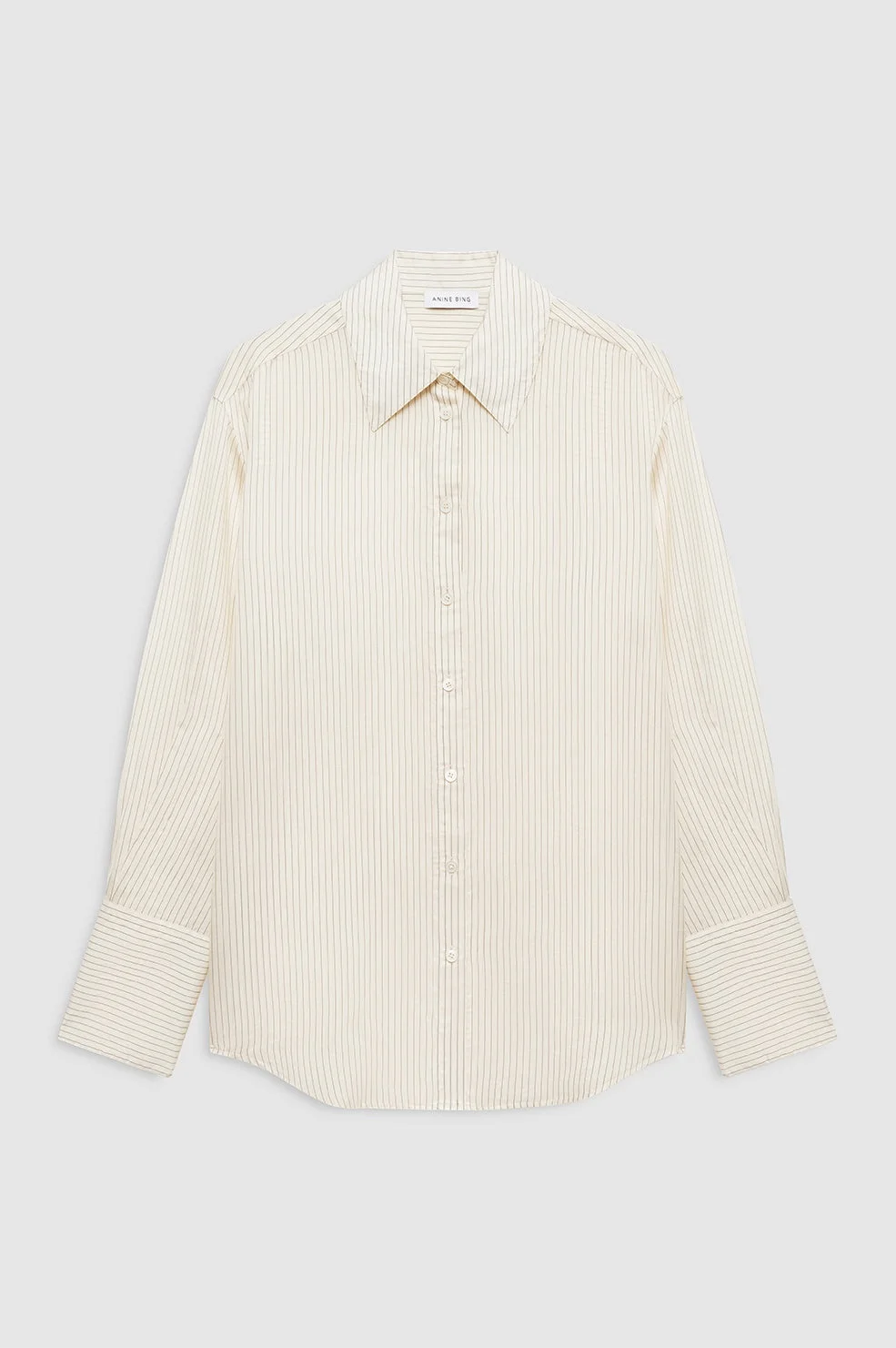 The Bridget Shirt is a classic button-up style made from lightweight 100% cupro in an ivory and black pinstripe. - Cupro - Oversized fit - Branded mother of pearl buttons - Wide, double-button cuffs FIT + MEASUREMENTS Oversized Fit: Take your true size. Model is wearing a size S. Model Measurements: Height: 5'7.5", Bust: 32", Waist: 23.5", Hips: 34.5" Product Measurements (Size S): Length: 30", Bust: 46.5", Sleeve Length from Center Back: 33.5" MATERIAL + CARE 100% Cupro Dry clean Made in Turkiye