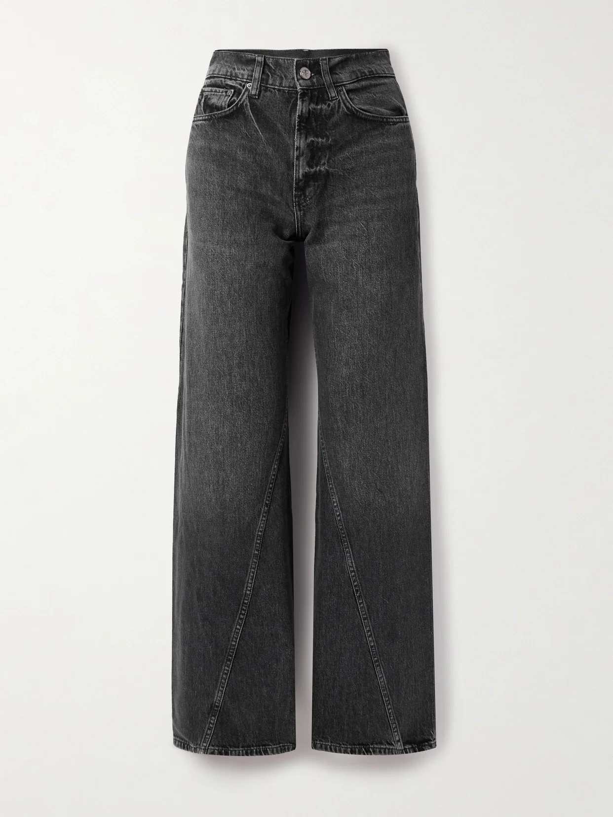 Anine Bing's 'Brie' jeans are made from panels of denim with twisted seams that wrap around the wide legs. Faded and whiskered for a well-worn feel, they're designed to sit high on the waist and have a classic five-pocket construction. A leather logo patch details the back.
