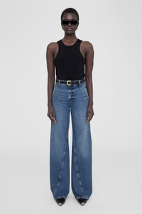 The Briley Jean has a trouser-inspired silhouette constructed from mid-to-lightweight rigid cotton denim without stretch featuring a soft hand and slight drape in a medium vintage blue wash with subtle veining throughout. - Rigid cotton denim - High rise intended to be worn low on the hips - Zipper-fly closure - Baggy, wide leg - Long inseam - Clean-edge hem - Five-pocket design - Twisted seam detailing FIT + MEASUREMENTS High Rise Wide: Option to keep original hem if alterations are desired. Take your true size. Model is wearing a size 24. Model Measurements: Height: 5'9", Bust: 30", Waist: 23", Hips: 34" Product Measurements (Size 27): Inseam: 34", Rise: 12.5", Waist: 29", Hip: 40.5", Leg Opening: 22" MATERIAL + CARE 100% Cotton Machine wash separately Made in Turkey