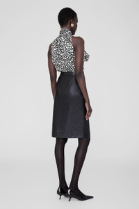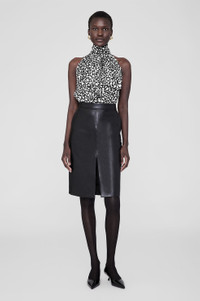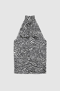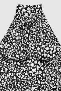 The Brooke Top is crafted from a 21 mm silk-rayon blend with an all-over, black and white heart print. This feminine separate features a long bow tie at the front with a concealed button and keyhole closure at the back neck. The sleeveless Brooke Top is cut for a slightly oversized silhouette. Take your true size. FIT + MEASUREMENTS The sleeveless Brooke Top is cut for a slightly oversized silhouette. Take your true size. Model is wearing a size S. Model Measurements: Height: 5'9", Bust: 30", Waist: 23", Hips: 34" Product Measurements (Size S): Length: 24”, Bust: 46" MATERIAL + CARE 56% Silk, 44% Rayon Dry clean Made in China