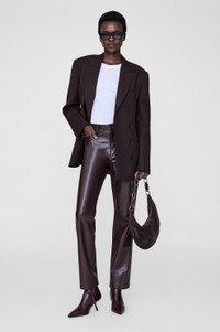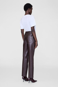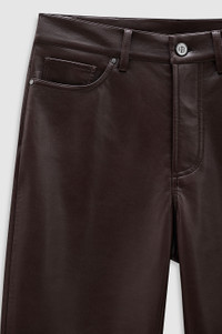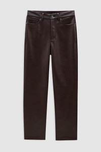A cropped pant crafted from soft yet structured 100% regenerated leather in deep brown. - Regenerated leather - Five-pocket design - Zip-front closure - Slim-straight leg - Cropped FIT + MEASUREMENTS High-Rise, Slim Straight Leg, Ankle-Length Inseam: Take your true size. Model is wearing a size 25. Model Measurements: Height: 5'9", Bust: 30", Waist: 23", Hips: 34" Product Measurements (Size 27): Inseam: 30", Rise: 10.5", Waist: 28.8", Hip: 37", Leg Opening: 14.5" MATERIAL + CARE 48% Leather, 25% Polyester, 27% Polyurethane Hand wash Made in China