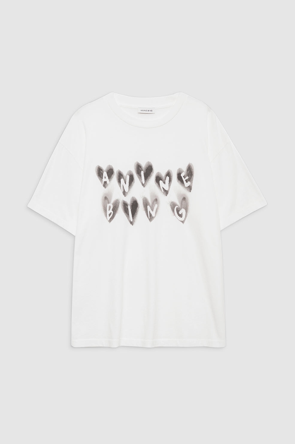The Cade Tee Hearts is constructed from lightweight 100% cotton jersey in a soft ivory wash. Its loose and boxy silhouette features screen-printed ANINE BING heart letters across the front. The Cade Tee is cut for a boxy fit with a loose neckline and a slightly shorter body than the Lili Tee. Take your true size. FIT + MEASUREMENTS The Cade Tee is cut for a boxy fit with a loose neckline and a slightly shorter body than the Lili Tee. Take your true size. Model is wearing a size S. Model Measurements: Height: 5'9", Bust: 30", Waist: 23", Hips: 34" Product Measurements (Size S): Length: 25.5", Bust: 22.5", Sleeve Length: 7.5" MATERIAL + CARE 100% Cotton Machine wash separately Made in Turkiye