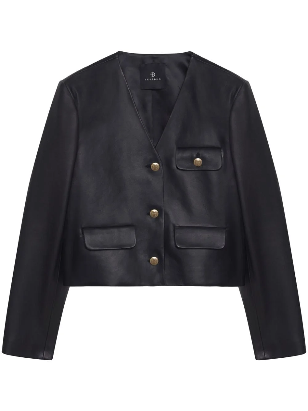 Cara leather jacket Anine Bing's Cara jacket is a lesson in timeless minimalism. It’s handcrafted from black leather with shoulder pads to enhance the boxy silhouette then detailed with a trio of flap pockets and polished gold-tone buttons. Highlights - Black - Leather - V-neck - Shoulder pads - Long sleeves - Three front flap pockets - Logo-print lining - Front button fastening Imported Composition Leather 100% Washing instructions Specialist Cleaning