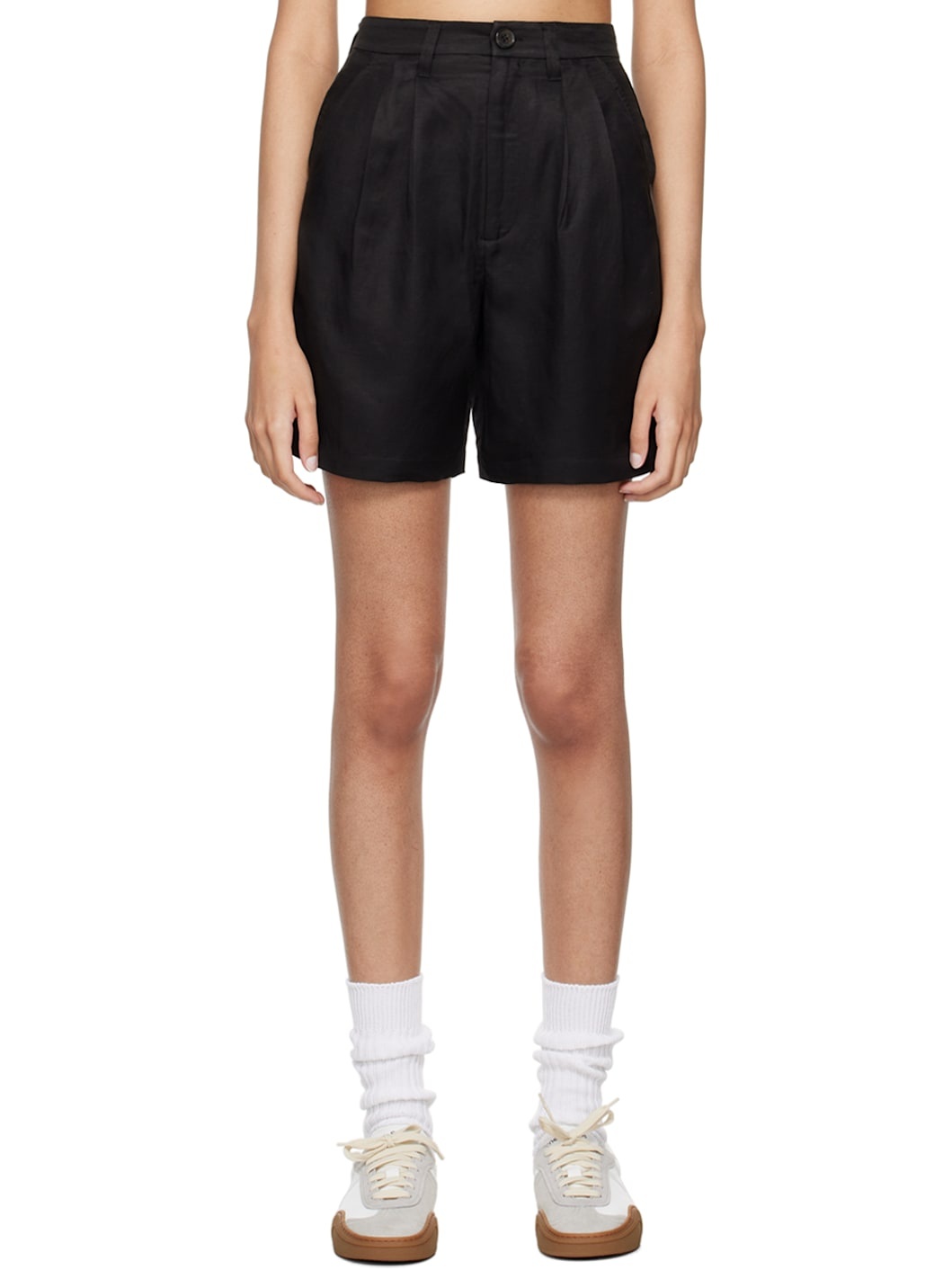 Relaxed-fit lightweight and breathable lyocell-blend twill shorts. · High-rise · Belt loops · Four-pocket styling · Zip-fly · Pleats at front Supplier color: Black linen blend Body: 35% lyocell, 33% rayon, 32% linen. Lining: 100% polyester. Made in China 242092F088003