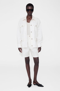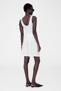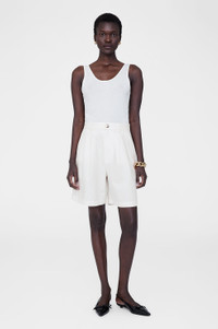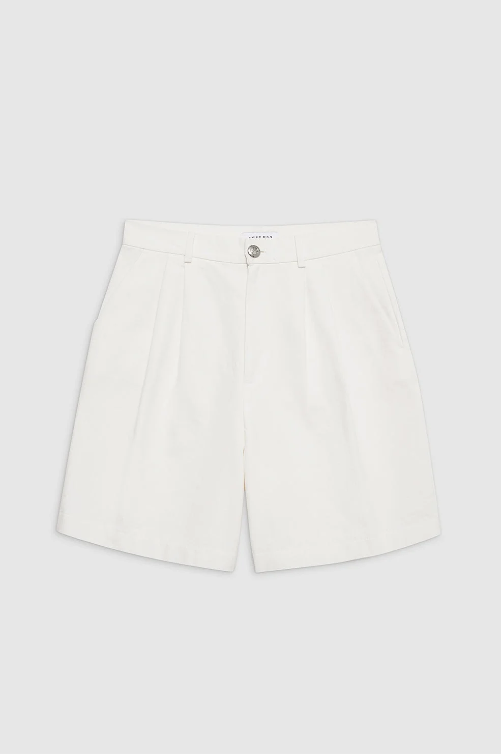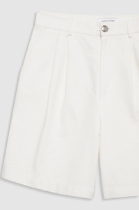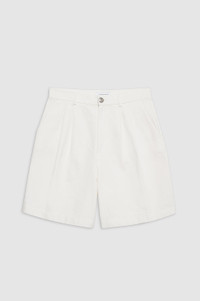 The Carrie Short is a pleated, trouser-inspired bottom made from midweight cotton canvas in ecru white. This tailored style is fully lined and features five functional belt loops, two back welt pockets, slanted front pockets, and a zip-front closure with a gold engraved button. FIT + MEASUREMENTS The Carrie Short is cut for a close, high-rise fit that relaxes through the thigh. Take your true size. Model is wearing a size 32. Model Measurements: Height: 5'9", Bust: 30", Waist: 23", Hips: 34" Product Measurements (Size 36/6): Inseam: 6.5", Rise: 12.5", Waist: 29", Hip: 42.5", Leg Opening: 23.8" MATERIAL + CARE 100% Cotton Dry clean Made in Turkiye