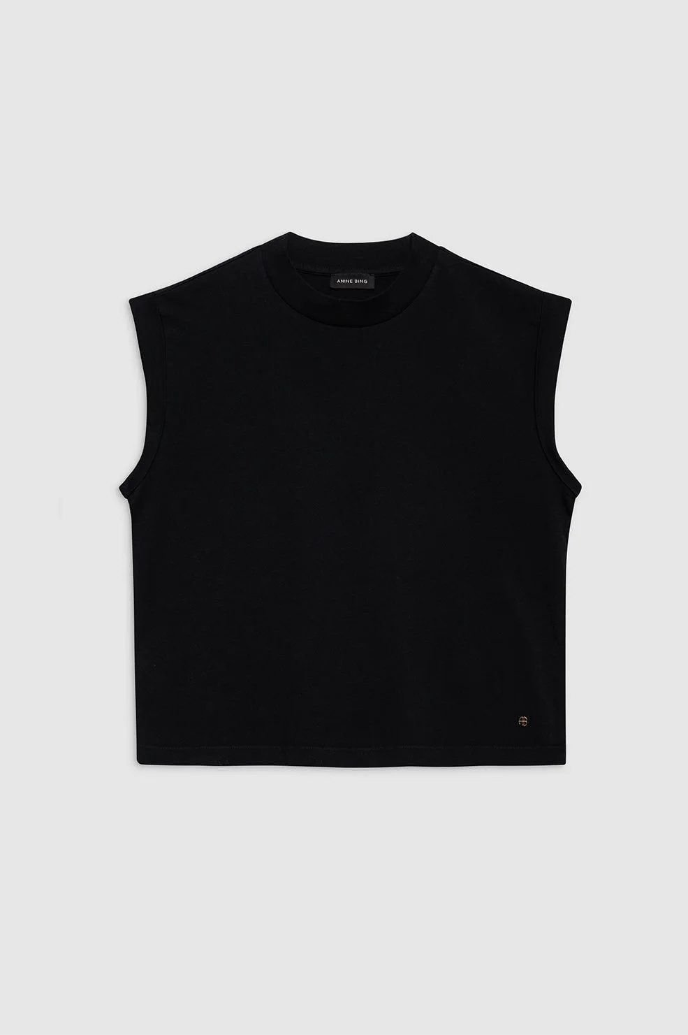 An elevated muscle tee crafted from a heavyweight cotton vintage jersey featuring a mock neckline and folded detailing at each sleeve. Finished with a small stitched ANINE BING monogram charm at the wearer's bottom-left hem. FIT + MEASUREMENTS The Caspen Tee is cut for a slim, boxy fit with a slightly cropped hem. Take your true size. Model is wearing a size S. Model Measurements: Height: 5'9", Bust: 30", Waist: 23", Hips: 34" Product Measurements (Size S): Length: 21", Bust: 19.5" MATERIAL + CARE 100% Cotton Machine wash Made in Turkiye