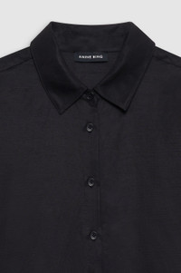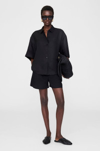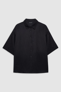The Coco Shirt is a boxy collared shirt made from a lightweight linen blend in black. - Linen blend - Boxy fit - Dropped shoulders - Long short sleeves with turnback cuffs - Branded tonal buttons FIT + MEASUREMENTS Boxy Fit: Take your true size. Model is wearing a size S. Model Measurements: Height: 5'9", Bust: 30", Waist: 23", Hips: 34" Product Measurements (Size S): Length: 26", Bust: 45.5", Sleeve Length: 10.5" MATERIAL + CARE 35% Lyocell, 33% Rayon, 32% Linen Dry clean Made in China
