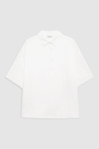 The Coco Shirt is a boxy collared shirt made from a lightweight linen blend in ivory. - Linen blend - Boxy fit - Dropped shoulders - Long short sleeves with turnback cuffs - Branded mother of pearl buttons FIT + MEASUREMENTS Boxy Fit: Take your true size. Model is wearing a size S. Model Measurements: Height: 5'9", Bust: 30", Waist: 23", Hips: 34" Product Measurements (Size S): Length: 26", Bust: 45.5", Sleeve Length: 10.5" MATERIAL + CARE 35% Lyocell, 33% Rayon, 32% Linen Dry clean Made in China