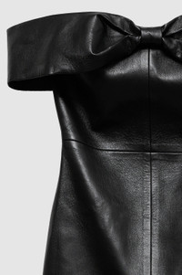 The Colleen Mini Dress is an off-the-shoulder staple—a recycled leather dress finished with a bow in the front. - Back zipper closure - Mini length FIT + MEASUREMENTS Model is wearing a size S. Model Measurements: Height: 5'9.5", Bust: 32.5", Waist: 24.5", Hips: 35" Product Measurements (Size S): Length: 26.6”, Bust: 31.5" MATERIAL + CARE 48% Leather, 27% Polyurethane, 25% Polyester Hand wash separately Made in China