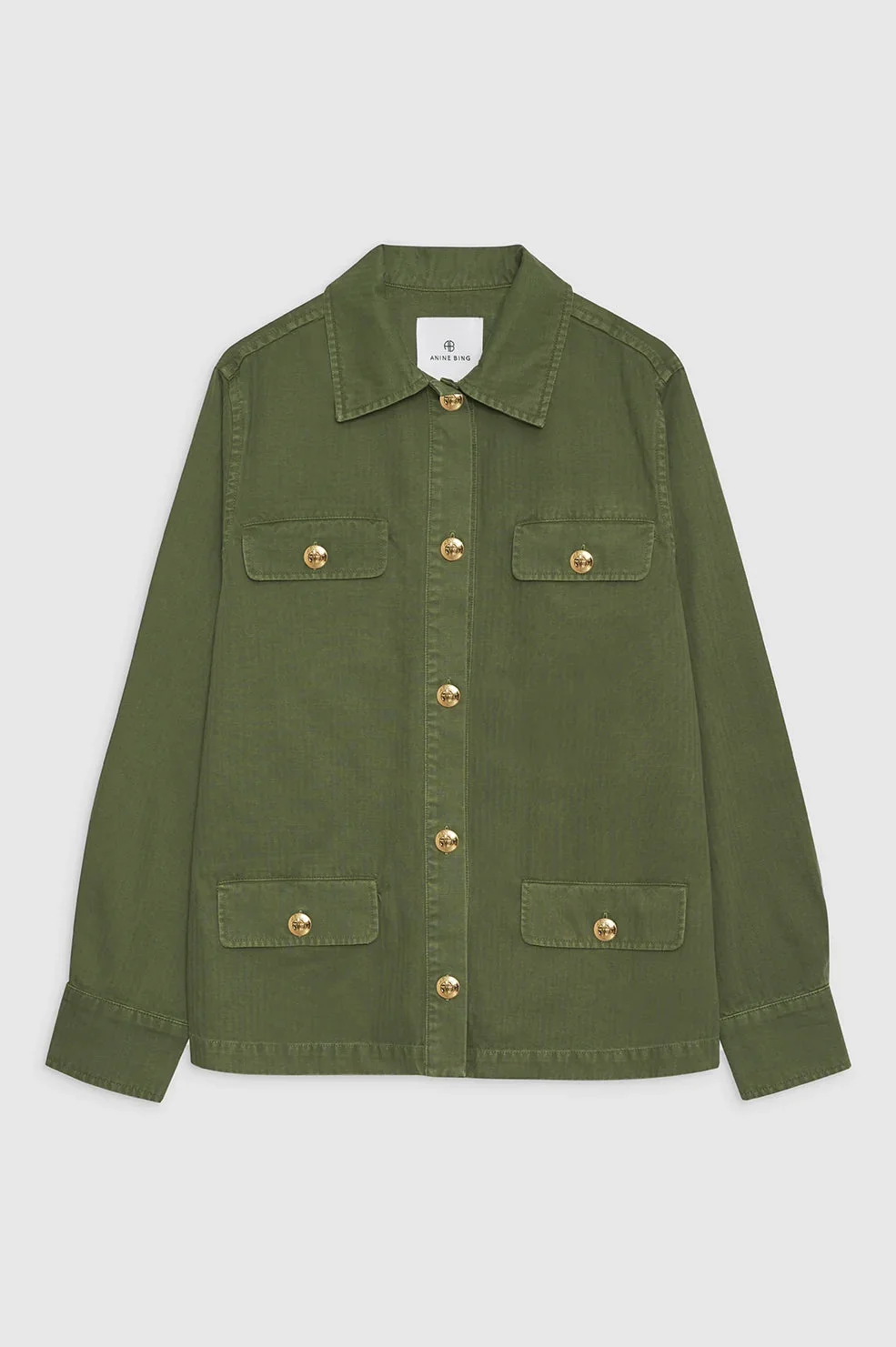 The Corey Jacket is made from midweight 100% cotton with a structured weave in a fine herringbone pattern. Its practical construction features full-length sleeves secured by single-button detailing at each cuff and four functional flap pockets. Accented with gold buttons with ANINE BING engraving down the center-front placket. The Corey Jacket is cut for a boxy fit. Take your true size. Please note: This item is individually handcrafted and will vary in color or appearance. FIT + MEASUREMENTS The Corey Jacket is cut for a boxy fit. Take your true size. Model is wearing a size S. Model Measurements: Height: 5'10.5", Bust: 31", Waist: 24", Hips: 34" Product Measurements (Size S): Length: 27", Bust: 41", Sleeve Length from Center Back: 32.5" MATERIAL + CARE 100% Cotton Dry clean Made in Turkey