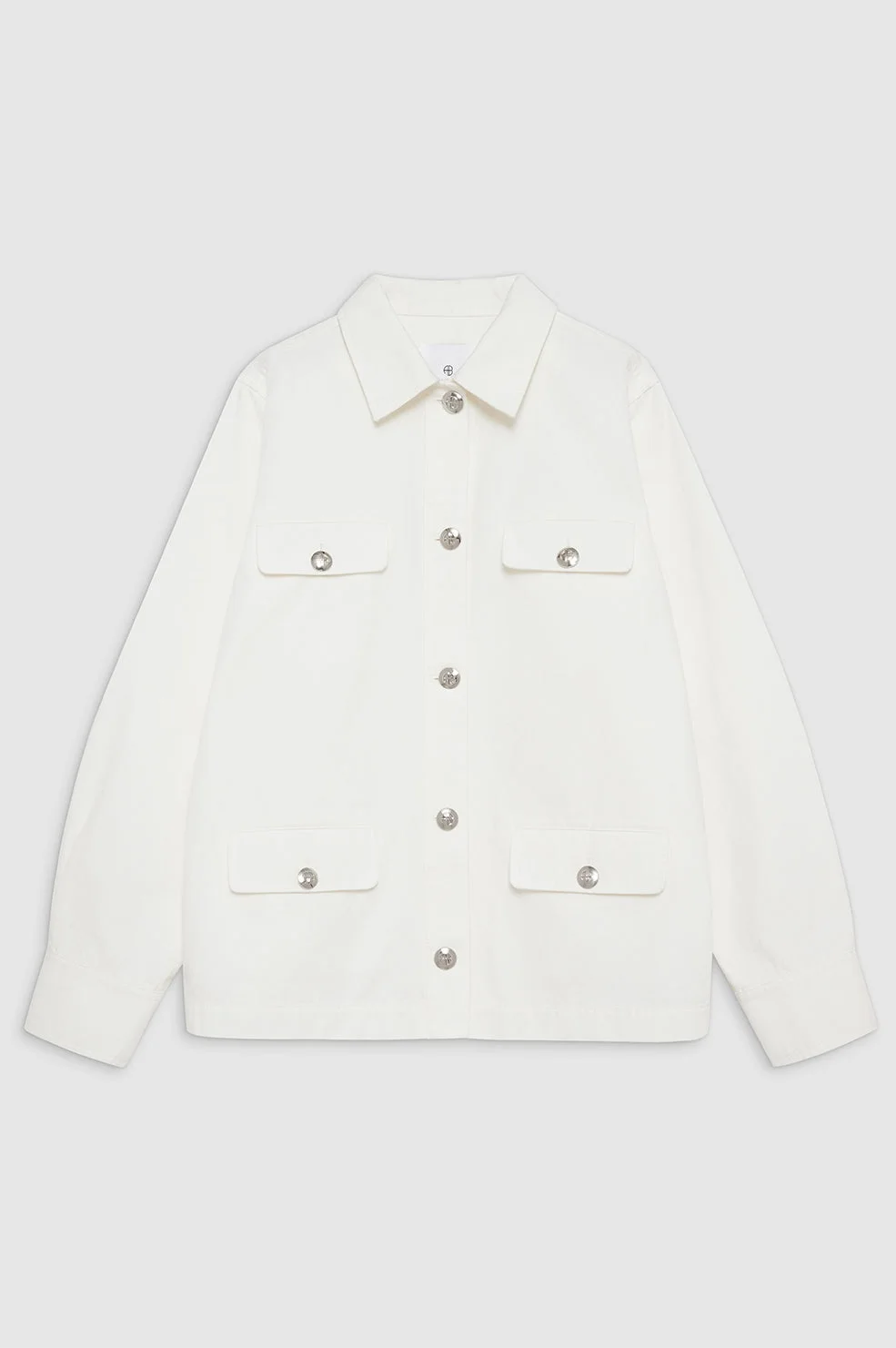 The Corey Jacket is made from midweight cotton canvas in ecru white. Its practical construction features full-length sleeves secured by single-button detailing at each cuff and four functional flap pockets. Accented with gold buttons with ANINE BING engraving down the center-front placket. FIT + MEASUREMENTS The Corey Jacket is cut for a boxy fit. Take your true size. Model is wearing a size S. Model Measurements: Height: 5'9.5", Bust: 32", Waist: 24.5", Hips: 33" Product Measurements (Size S): Length: 27", Bust: 41", Sleeve Length from Center Back: 32.5" MATERIAL + CARE 100% Cotton Dry clean Made in Turkiye