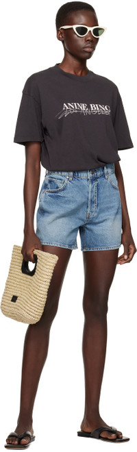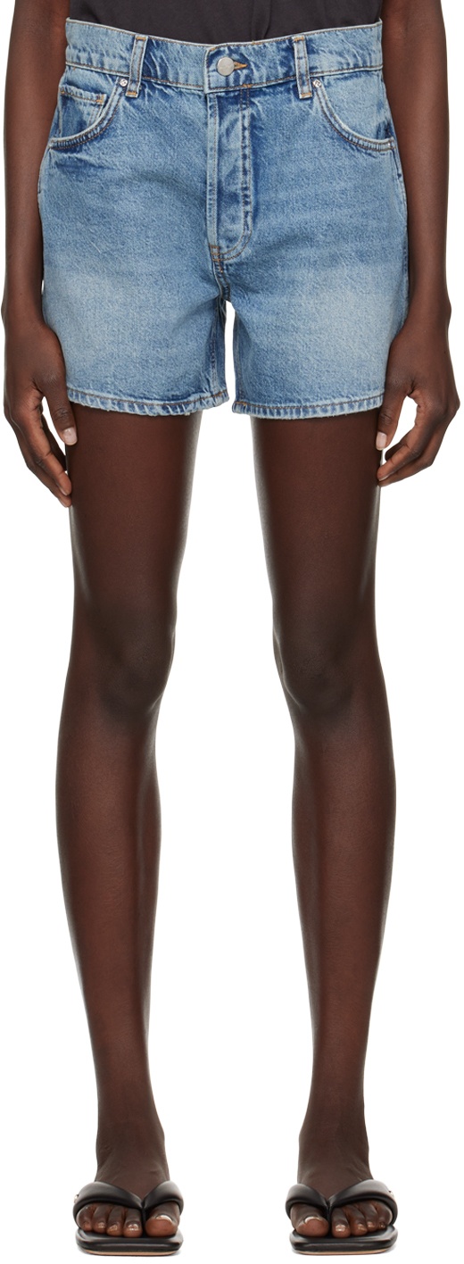 Relaxed-fit lightweight non-stretch denim shorts. Fading and whiskering throughout. · High-rise · Belt lops · Five-pocket styling · Button-fly · Leather logo patch at back waistband · Contrast stitching in orange Supplier color: Washed blue