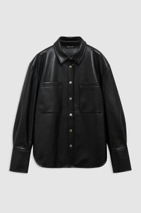 The oversized Dante Shirt is a vegan leather uniform essential featuring two large front patch pockets with tonal buttons down its wide, center-front placket. Finished with wide cuffs and an oversized fit. The Dante Shirt is cut for an oversized fit. Take your true size. FIT + MEASUREMENTS Model is wearing a size S. Model Measurements: Height: 5'9", Bust: 30", Waist: 23, Hips: 33" Product Measurements (Size S): Length: 28.5", Bust: 47", Sleeve Length from Center Back: 33.5" MATERIAL + CARE 48% Leather, 25% Polyester, 27% Polyurethane Hand wash Made in China