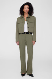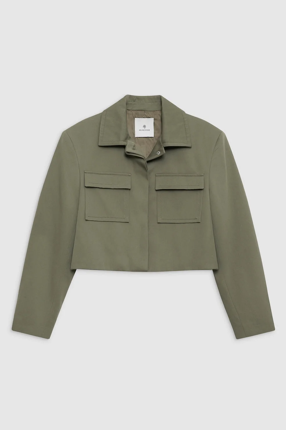 A modern take on the iconic safari jacket silhouette. The Dayton Jacket in olive is constructed from a light-to-midweight 100% cotton-twill fabrication with a smooth hand and slight sheen. Its utilitarian silhouette is fully lined and features two patch pockets at the chest and a hidden placket down the center front and at each wrist. The Dayton Jacket is cut for a cropped, boxy fit. Take your true size. FIT + MEASUREMENTS The Dayton Jacket is cut for a cropped, boxy fit. Take your true size. Model is wearing a size S. Model Measurements: Height: 5'9.5", Bust: 29.5", Waist: 23", Hips: 34.5" Product Measurements (Size S): Length: 20", Bust: 41.5", Sleeve Length from Center Back: 33.5" MATERIAL + CARE 100% Cotton Dry clean Made in Portugal
