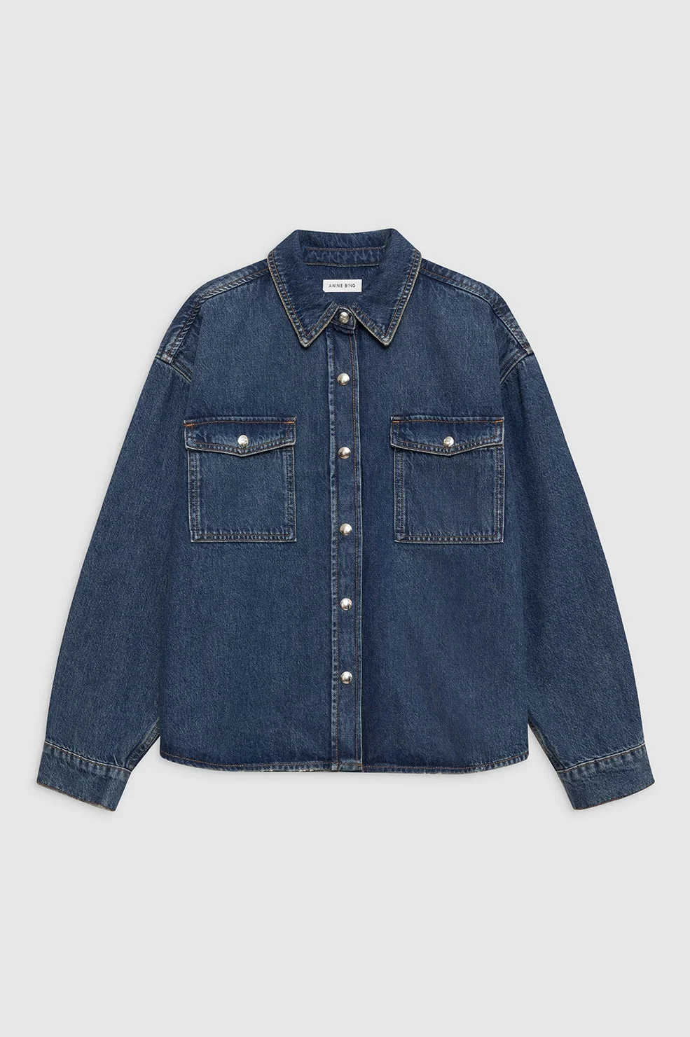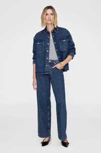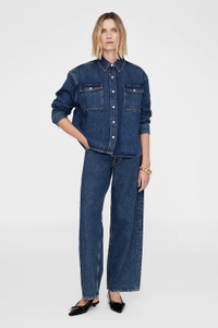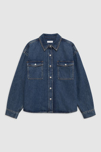 The Paxton Shirt is constructed from a midweight, rigid cotton denim blend without stretch in a deep sea blue wash for a clean, vintage look. This modern workwear staple features wide shoulders, two patch pockets at the chest and front placket complete with branded snap buttons. The Paxton Shirt is cut for a cropped, boxy fit with wide shoulders. Take your true size. FIT + MEASUREMENTS The Paxton Shirt is cut for a cropped, boxy fit with wide shoulders. Take your true size. Model is wearing a size S. Model Measurements: Height: 5'9.5", Bust: 32", Waist: 24.5", Hips: 33" Product Measurements (Size S): Length: 25.5", Bust: 52", Sleeve Length from Center Back: 33.5" MATERIAL + CARE 80% Cotton, 20% Post Consumer Recycled Cotton Machine wash separately Made in Turkiye