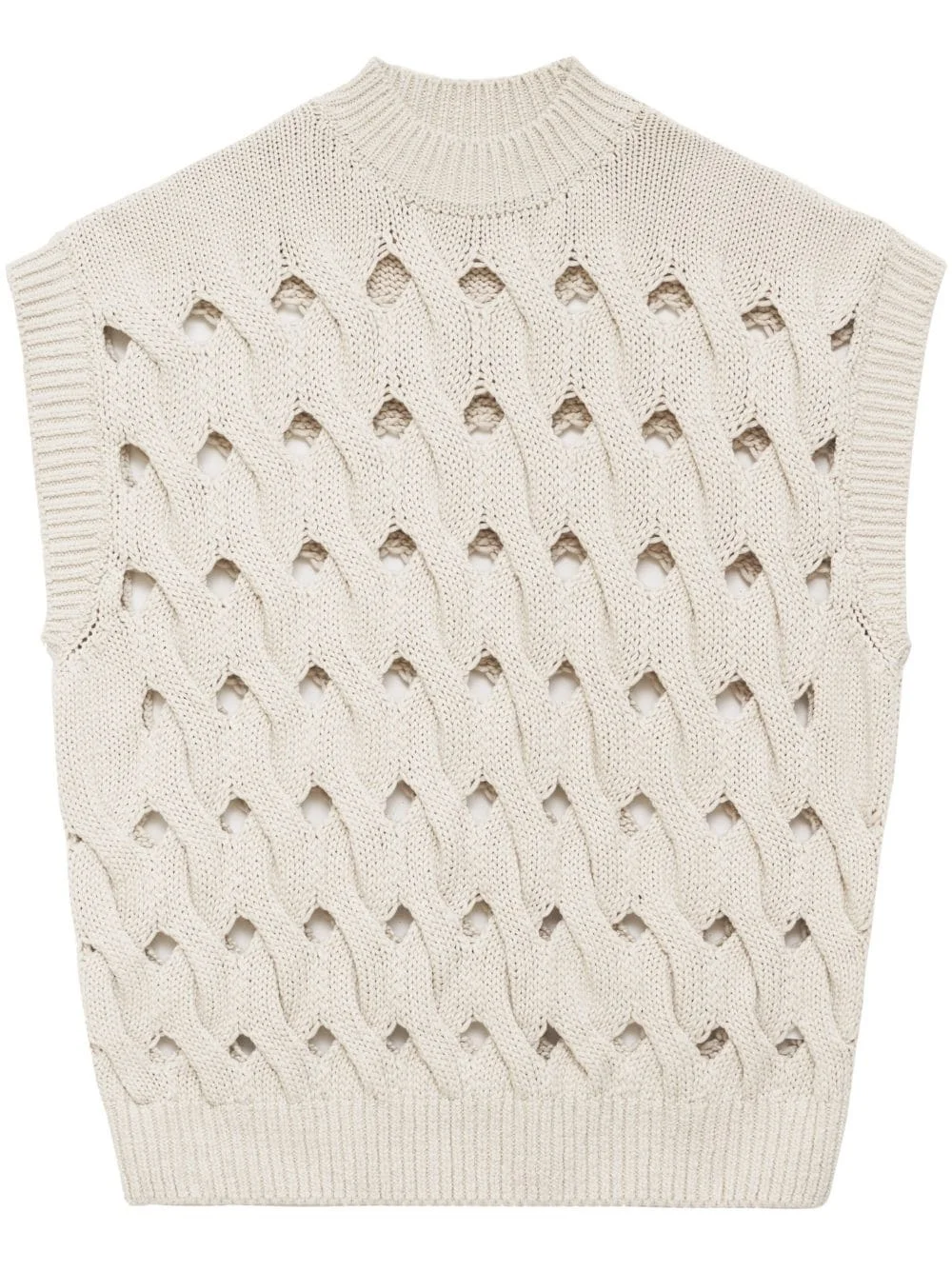 Dray open-knit vest Reflecting the brand's minimalist aesthetic for AW23, Annie Bing presents this vest. Characterised by a open-knit design, the cream cotton-blend construction adds a timeless feel to the garment. Highlights - Cream beige - Cotton blend - Open knit - Cable stitch - Crew neck - Sleeveless - Ribbed trim - Straight hem Imported Composition Cotton 80%, Polyester 20%
