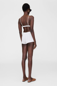 The Eldra Bra is a classic triangle style crafted from a delicate pointelle fabrication with a novelty trim. - Pointelle - Novelty trim - Close fit - Minimal support - Satin-encased elastic at the underbust - Adjustable straps - Back hook closure - Hand-tacked monogram charm FIT + MEASUREMENTS Close Fit: Take your true size. Model is wearing a size S. Model Measurements: Height: 5'9", Bust: 30", Waist: 23", Hips: 34" Product Measurements (Size S): Strap Length: 13.5" (Adjustable), Under Bust Width: 13", Cup Height: 6.8" MATERIAL + CARE 60% Polyester, 35% Rayon Machine wash Made in China