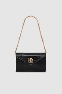 A timeless envelope clutch crafted from 100% leather stamped with faux croco-embossed texture in a mid-shine finish. The Small Elly Clutch features a monogram framed in exceptional gold hardware and a fully lined compartment with an interior slip pocket secured by a custom magnetic snap closure. Complete with a removable, gold curb-chain strap and signature link clasps. FIT + MEASUREMENTS Model Measurements: Height 5′10", Bust 32", Waist 24", Hips 35" Product Measurements: Length: 5.6", Width: 9.1" MATERIAL + CARE 100% Cow Leather Spot clean Made in Turkey