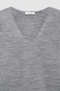 The Essex Dress is made from a lightweight, grey melange wool blend in an all-over interlock stitch. Its fully fashioned silhouette features an oversized upper body with removable shoulder pads, dropped shoulder seams, and a deep V-neckline. The Essex Dress is cut for an oversized upper body with tapered sleeves and a straight, mini-length hemline. Take your true size. FIT + MEASUREMENTS The Essex Dress is cut for an oversized upper body with tapered sleeves and a straight, mini-length hemline. Take your true size. Model is wearing a size S. Model Measurements: Height: 5'9.5", Bust: 32", Waist: 24.5", Hips: 33" Product Measurements (Size S): Length: 34”, Sleeve Length from Center Back: 33" MATERIAL + CARE 91% Wool, 8% Nylon, 1% Spandex Hand wash Made in China