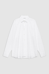 A classic tailored shirt made from a lightweight 100% cotton poplin fabrication with a crisp, structured look. The Essie Shirt's traditional construction includes slightly dropped shoulder seams, a discrete shirttail hem, and back yoke. Finished with mother of pearl buttons down the center front, double-button detailing at the cuff, and a hidden framed monogram embroidered within the front placket. FIT + MEASUREMENTS The Essie Shirt is cut for an oversized, boyfriend-inspired fit. Take your true size. Model is wearing a size S. Model Measurements: Height: 5'9.5", Bust: 29.5", Waist: 23", Hips: 34.5" Product Measurements (Size S): Length: 28.8", Bust: 47.5", Sleeve Length from Center Back: 33.05" MATERIAL + CARE 100% Cotton Machine wash separately Made in Portugal