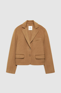 An blazer made from a heavyweight, double-faced wool-cashmere blend, featuring a cropped fit, notched collar, and single-breasted closure with two buttons. - Double-faced wool-cashmere - Single-breasted, two-button closure - Notched collar - One welt pocket at the chest - Two flap pockets at the Hips FIT + MEASUREMENTS Model is wearing a size S. Model Measurements: Height: 5'9", Bust: 30", Waist: 23, Hips: 33" Product Measurements (Size S): Length: 23.5", Bust: 42", Sleeve Length from Center Back: 33.5" MATERIAL + CARE 90% Wool 10% Cashmere Dry clean Made in China