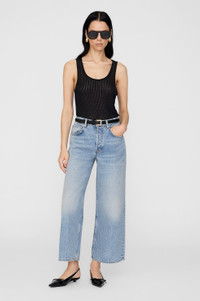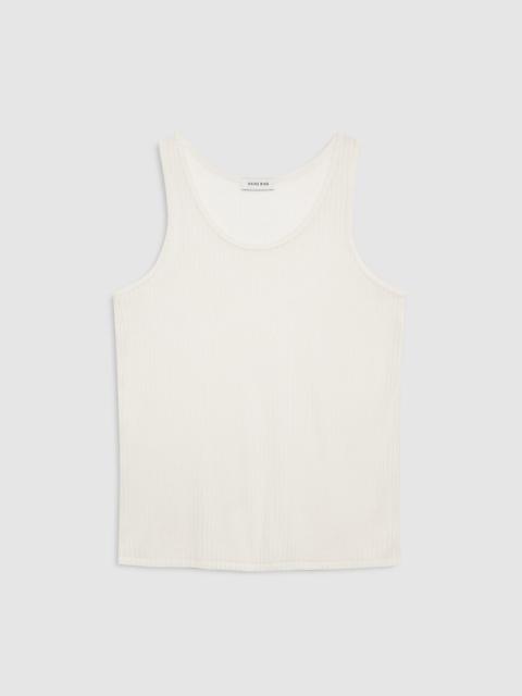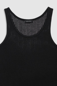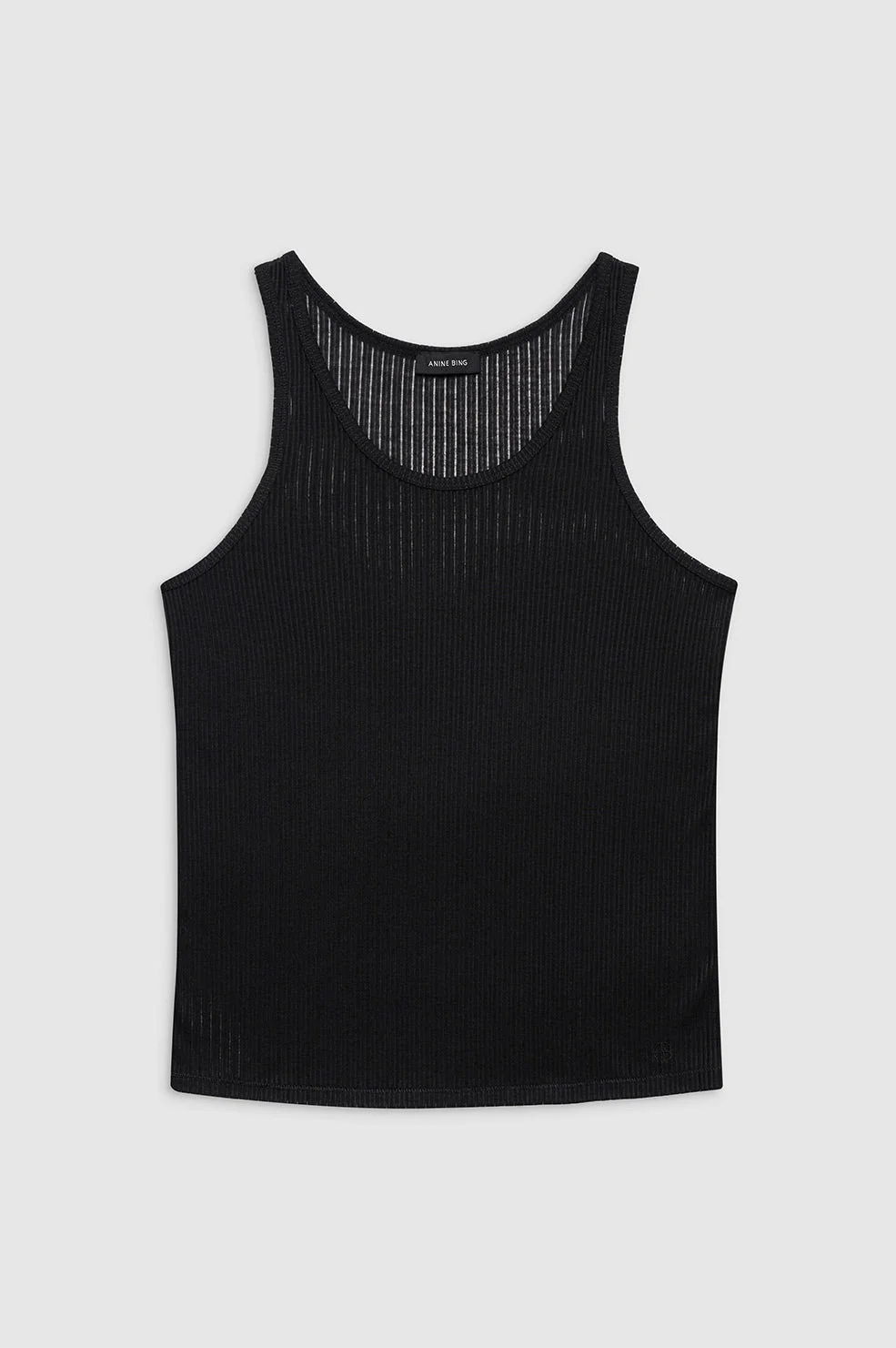 The Euguen Tank is an everyday basic made from a lightweight and slightly sheer drop needle rib fabrication in black. - Viscose blend - Relaxed, boyfriend-inspired fit - Scoop-front neckline - Tonal embroidered monogram FIT + MEASUREMENTS Relaxed, Boyfriend-Inspired Fit: Take your true size. Model is wearing a size S. Model Measurements: Height: 5'9.5", Bust: 32.5", Waist: 24.5", Hips: 35" Product Measurements (Size S): Length: 25.3”, Bust: 17.5" MATERIAL + CARE 80% Polyester, 20% Viscose Machine wash Made in China