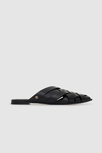 A woven slip-on with flat straps made from smooth 100% leather in black. - Leather - Subtle pointed toe - Woven padded straps - Cushioned insole - High-shine leather outsole - Gold monogram hardware FIT + MEASUREMENTS Take your true size. If you are between sizes, we recommend taking the next size up. Model is wearing a size 40. Model Measurements: Height: 5'9", Bust: 30", Waist: 23", Hips: 34" Product Measurements (Size 37): Heel Height: 0.3", Sole Length: 10.6", Sole Width: 3.1" MATERIAL + CARE 100% Goat Leather Spot clean Made in Portugal