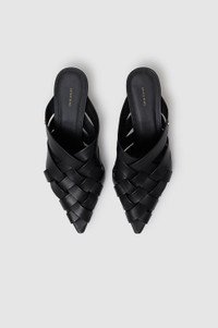 A woven mule with flat straps made from smooth 100% leather in black. - Leather - Subtle pointed toe - Woven padded straps - Setback heel - Cushioned insole - High-shine leather outsole - Gold monogram hardware FIT + MEASUREMENTS Take your true size. If you are between sizes, we recommend taking the next size up. Model is wearing a size 40. Model Measurements: Height: 5'7.5", Bust: 32", Waist: 23.5", Hips: 34.5" Product Measurements (Size 37): Heel Height: 2.4", Sole Length: 9.6", Sole Width: 3" MATERIAL + CARE 100% Cow Leather Spot clean Made in Portugal