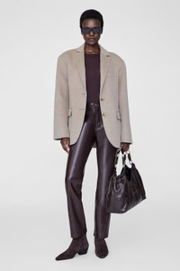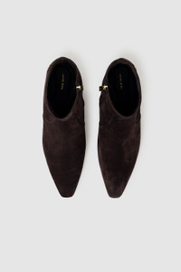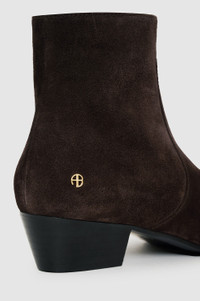 A squared-toe boot crafted from dark brown suede. - Leather - Square toe - Inner zip opening - Low slanted stacked heel - Cushion insole - Gold monogram hardware FIT + MEASUREMENTS True to size. If you are between sizes, we recommend taking the next size up. Model is wearing a size 36. Model Measurements: Height: 5'9", Bust: 30", Waist: 23", Hips: 34" Product Measurements (Size 37): Heel Height: 1.7", Sole Length: 10", Sole Width: 3.1", Shoe Height: 9.7" MATERIAL + CARE 100% Cow Leather Made in Italy