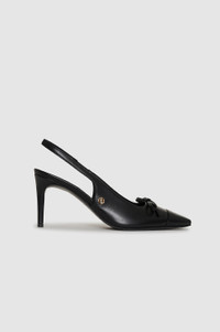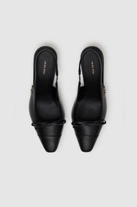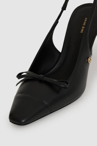 A sophisticated heel made from smooth 100% leather. The Freya Slingbacks feature a flat bow detail across the top with a square toe, high heel, and slingbacks with elastic. Finished with a padded insole, high-shine leather outsole, and gold-tone ANINE BING hardware. Take your true size. If you are between sizes, we recommend taking the next size up. FIT + MEASUREMENTS Take your true size. If you are between sizes, we recommend taking the next size up. Model is wearing a size 40. Model Measurements: Height: 5'9.5", Bust: 32", Waist: 24.5", Hips: 33" Product Measurements (Size 37): Sole Length: 9.3", Sole Width: 1.5", Heel Height: 3.1", Shoe Height: 3.3" MATERIAL + CARE 100% Cow Leather Spot Clean Made in Italy