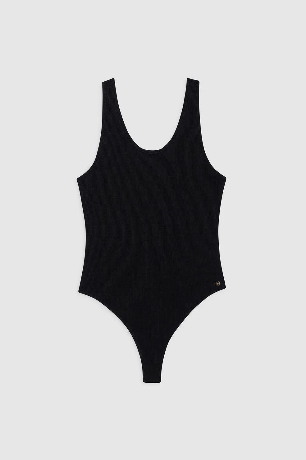 The Ginny Bodysuit is crafted from a lightweight rayon-spandex fabrication with an all-over micro ribbed texture and natural drape. It features a plunging scoop neckline and effortless, pull-on construction. Finished with a small hand-tacked ANINE BING monogram charm. The Ginny Bodysuit is cut for a fitted silhouette. Take your true size. FIT + MEASUREMENTS The Ginny Bodysuit is cut for a fitted silhouette. Take your true size. Model is wearing a size S. Model Measurements: Height: 5'9.5", Bust: 29.5", Waist: 23", Hips: 34.5" Product Measurements (Size S): Length: 28", Bust: 13" MATERIAL + CARE 92% Rayon 8% Spandex Machine wash Made in China