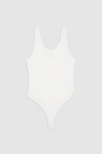 The Ginny Bodysuit is crafted from a lightweight rayon-spandex fabrication with an all-over micro ribbed texture and natural drape. It features a plunging scoop neckline and effortless, pull-on construction. Finished with a small hand-tacked ANINE BING monogram charm. The Ginny Bodysuit is cut for a fitted silhouette. Take your true size. FIT + MEASUREMENTS The Ginny Bodysuit is cut for a fitted silhouette. Take your true size. Model is wearing a size S. Model Measurements: Height: 5'9.5", Bust: 29.5", Waist: 23", Hips: 34.5" Product Measurements (Size S): Length: 28", Bust: 13" MATERIAL + CARE 92% Rayon, 8% Spandex Machine wash Made in China