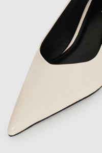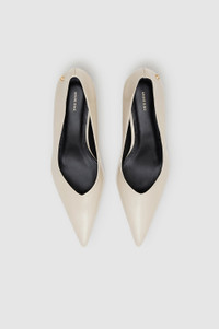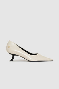 An elegant dress heel crafted from 100% spazzolato leather in bone with a high-shine finish. The Hilda Pumps' sleek construction features a sharp pointed toe, angular kitten heel, high-shine leather outsole, and cushioned insole. Accented with gold-tone ANINE BING hardware at each heel. True to size. If you are between sizes, we recommend taking the next size up. FIT + MEASUREMENTS True to size. If you are between sizes, we recommend taking the next size up. Model is wearing a size 40. Model Measurements: Height: 5'9.5", Bust: 32", Waist: 24.5", Hips: 33" Product Measurements (Size 37): Sole Length: 10.1", Sole Width: 2.8", Heel Height: 1.9", Shoe Height: 3.7" MATERIAL + CARE 100% Cow Leather Spot Clean Made in Portugal