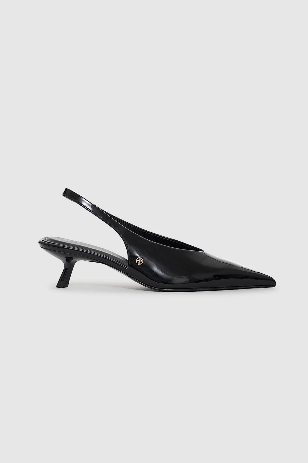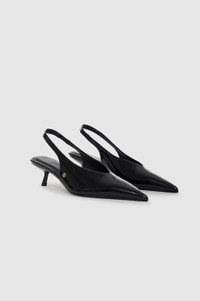An elegant pump made from black patent leather with a high-shine finish. The Hilda Pumps' sleek construction features a sharp pointed toe, angular kitten heel, high-shine outsole, and cushioned insole. Finished with thin slingbacks with elastic to comfortably secure your foot. FIT + MEASUREMENTS True to size. If you are between sizes, we recommend taking the next size up. Model is wearing a size 39. Model Measurements: Height: 5'9.5", Bust: 32", Waist: 24.5", Hips: 33" Product Measurements (Size 37): Heel Height: 2", Sole Length: 10", Sole Width: 2.7" MATERIAL + CARE 100% Cow Leather Spot clean Made in Portugal