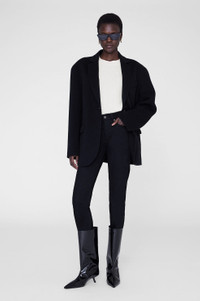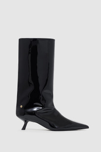 A modern pair of wide-shaft boots hitting just below the knee made from smooth leather in black with a slight sheen. - Leather - Pull-on construction - Sharp pointed toe - Low slanted heel - High-shine outsole - Gold monogram hardware FIT + MEASUREMENTS Model is wearing a size 37. Model Measurements: Height: 5'9", Bust: 30", Waist: 23", Hips: 34" Product Measurements (Size 37): Sole Length: 10", Sole Width: 2.6", Heel Height: 2.0", Shoe Height: 15.6", Calf Circumference: 14.6" MATERIAL + CARE 100% Cow Leather Spot clean Made in Portugal
