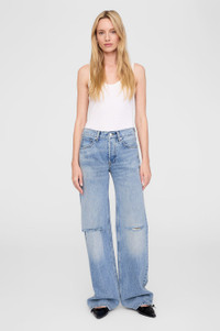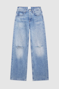 The Hugh Jean is a relaxed, '90s-inspired jean constructed from midweight 100% regenerative cotton without stretch in a destructed blue wash. - Regenerative cotton - Relaxed fit - Distressing at the knees - Mid rise intended to be worn low on the hips - Button-fly closure - Wide leg - Long inseam - Clean-edge hem FIT + MEASUREMENTS Mid Rise Relaxed Wide: Take your true size. If you are in between sizes, we recommend taking one size up in this style. Model is wearing a size 24. Model Measurements: Height: 5'7.5", Bust: 32", Waist: 23.5", Hips: 34.5" Product Measurements (Size 27): Inseam: 34", Rise: 11.3", Waist: 31", Hip: 40", Leg Opening: 21" MATERIAL + CARE 100% Regenerative Cotton Machine wash separately Made in Turkiye
